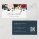 Elegant floral business cards feature your name and business name or title in a chic combo of block and handwritten script lettering, topped by a lush watercolor bouquet of jewel tone flowers and greenery. Add your contact information to the reverse side in white on rich navy blue, and customise the QR code to make it easy for customers to connect with you.