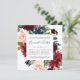 Our Radiant Bloom floral rehearsal dinner invitation in a unique square format frames your wedding ceremony rehearsal and dinner details with painted watercolor flowers in blush pink, burgundy marsala and navy blue, with green eucalyptus foliage.