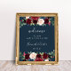 Welcome guests to your wedding with our Radiant Bloom poster, featuring jewel tone watercolor flowers and lush botanical greenery, with "welcome to our happily ever after," your names, and wedding date in a chic mix of modern block and hand lettered calligraphy typefaces on a rich navy blue background.