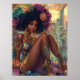 A stunning digital artwork of a woman with an afro adorned with vibrant flowers, sitting amidst a futuristic cityscape. She is dressed in a shimmering gold outfit and high heels, exuding elegance and confidence. The background features towering skyscrapers under a dramatic sunset sky, creating a striking contrast between the natural beauty of the flowers and the urban environment. This image is perfect for showcasing on Zazzle, highlighting its blend of nature and modernity.