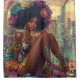 A stunning digital artwork of a woman with an afro adorned with vibrant flowers, sitting amidst a futuristic cityscape. She is dressed in a shimmering gold outfit and high heels, exuding elegance and confidence. The background features towering skyscrapers under a dramatic sunset sky, creating a striking contrast between the natural beauty of the flowers and the urban environment. This image is perfect for showcasing on Zazzle, highlighting its blend of nature and modernity.