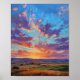 This expressive oil painting captures the dramatic transition of a sunset over a sprawling rural landscape. The composition is dominated by a vast, energetic sky filled with sculptural clouds rendered in shades of deep violet, magenta, and brilliant turquoise. At the horizon, the sun breaks through with a piercing golden glow, casting long rays that illuminate the rolling hills and patchwork fields below. The foreground features a rich, amber-toned meadow, while the distant mountains are bathed in a soft, cool blue haze. The heavy impasto technique adds a physical depth to the canvas, making the light feel as though it is vibrating off the surface.