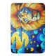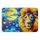 A radiant lion with a flowing golden mane gazes forward, surrounded by a vivid night sky filled with a glowing moon, swirling clouds, and bright stars. The bold colours and intricate patterns create a striking, dreamlike scene that blends celestial beauty with powerful animal presence.