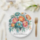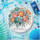 A vivid and detailed floral arrangement showcasing peonies in pink, orange, and teal hues. The rich, layered petals and luminous centres are complemented by green leaves and smaller orange blossoms. The bouquet is artistically composed with the flowers radiating outward, evoking elegance and harmony.