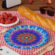 A multi-colour fractal image; orange pink and blue on a darker background.
