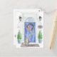 Announce your new address with our stylish announcement featuring a Ragamuffin cat, blue front door, welcome mat, slate sign, topiaries and a floral wreath set on a gray brick background.