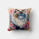 Throw pillow features delicate watercolor artwork of a beautiful rag doll cat surrounded by flowers in a feminine aesthetic animal portrait.
