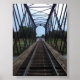 In terms of lighting, it appears to be midday given the brightness and lack of long shadows, but the atmosphere is somewhat moody due to the cloudy sky and the industrial aesthetic of the bridge contrasted against the natural environment. The composition is symmetrical, with the central railroad ties dividing the image into two mirrored halves.