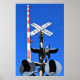 This poster featuring railroad crossing with gate looking upward is perfect for anyone who is a railfan and/or works for a railroad seeking railroad photography that looks great in any room, office,or that special model train room. This item is also ideal for year round gift giving.