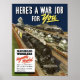 This vintage World War II poster features trains speeding their cargo down the rails. It declares, "Here's a war job for you -- Railroad Workers Urgently Needed. Apply to any railroad office or agent -- any offices of the railroad retirement board -- or to the U.S. Employment Service." Celebrate American and WW2 History with this digitally restored vintage war poster product from The War Is Hell Store.