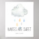 This rain cloud boy babies are sweet enjoy a treat sign is perfect for a modern baby shower. The cute and simple design features pastel teal, light blue, yellow and gray watercolor raindrops falling from a soft gray cloud.