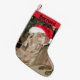 Cute photo of Rain, a sweet Weimaraner Dog, wearing a Santa hat on a Christmas Stocking. Text is easily customisable.