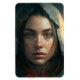 Young woman in the rain, in the style of spatial concept art, dark gold and red, detailed facial features, detailed character illustrations, hyper-realistic portrait, enchanting realms