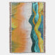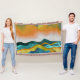 Abstract landscape scene of a mountain vista with rolling hills and a rain storm in orange, gold, blue, and cyan.