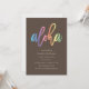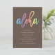 This party invitation features the word "aloha" in a rainbow handwritten script. Background colour and text fields are fully customisable.