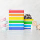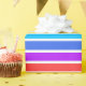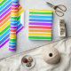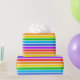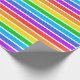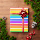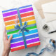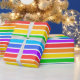 A wrapping paper designed with a striped pattern with bright rainbow colors and white.