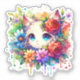 A cute rainbow anime kitten nestled in colourful flowers with big blue eyes.