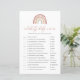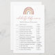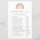 Rainbow themed baby shower celebrity baby names game card features a watercolor rainbow illustration and elegant handwritten style font.