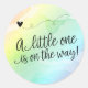 This pretty sticker features a watercolor rainbow of colours and the text "A little one is on the way". Use as a favour tag or envelope seal.