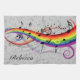 Black musical notes floating on a rainbow of swirling rainbow colours. The background is grey musical notes on a lighter shade. Add your own personalised name to create a unique gift for the music lover.