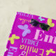 Cute little graphic outline butterflies personalised name beach towel. This purple, aqua blue, pink, lime green, yellow and cream text typographical towel can also be customised with your own short name, currently reads Emilia. Other names and colours available or contact me for name requests. Original art and design by Sarah Trett for www.mylittleeden.com
