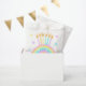 This rainbow cake design features a hand drawn rainbow cake with with candles and sprinkles on top with rainbow stars around the outside. Customise the text for your occassion. See the whole matching party collection.