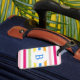 Rainbow colored candy stripes on monogrammed luggage tag.