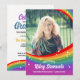 Rainbow themed graduation invitation and announcement in one printed with your graduate's photo inside a printed rainbow frame with white sparkles in a cartoonish style. Add their name in a retro script. On the back, add the graduation celebration information above another sparkly rainbow. A colourful graduation invitation card perfect for an LGBTQ graduate!