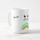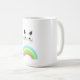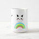 A cute and colourful children's drawing of a cat's face floating above a rainbow.