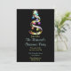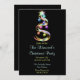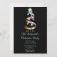 A rainbow christmas tree on a black background. The back of the invite is black with snow pattern