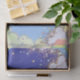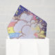 Pretty pastel clouds in pink, green, yellow and purple, against a blue summer sky with a rainbow and confetti tissue paper. Perfect for birthdays.