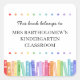 For the kindergarten teacher. These cheerful rainbow colors book stickers are perfect for kindergarten teachers who want to keep their classroom library organized with a warm, personal touch. Perfect for labeling books, take‑home readers, and classroom materials, they’re a thoughtful gift from parents, students, or fellow teachers - especially during Teacher Appreciation Week or ideal for a self-purchase. A bright, practical addition to any classroom planning routine. Personalize with the inclusion of your text.