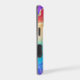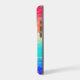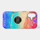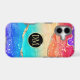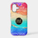 This elegant phone case features your two letter monogram in gold at the centre of a black circle banner that is double framed in gold. The banner is placed on a vibrant rainbow colour abstract background. Colours used include pink, orange, purple, aqua, tan, and blue, with tiny silver and gold faux glitter confetti.