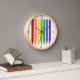 This modern design round clock is simply decorated with chunky wax crayons in rainbow colours (red, orange, yellow, green, blue, indigo and violet), and just four numbers; 12, 3, 6 and 9. The numbers are black and the clock face is white. It would look good in a class room, craft room, on an art room wall, or any modern setting.