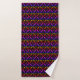 Colourful bath towel set has a rainbow ombre concho diamond style flower pattern on black background.