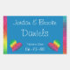 Tired of typical wedding colours? Try a touch of bright rainbow colours to liven things up! The background (shown here in blue) on this this simple yet elegant design can be changed to any colour you want as can the text colours. Choose from either hearts (shown) or butterflies as the decorative accent on your labels. If you'd prefer something extra personal on your stickers you can even upload an image of your own choosing instead.