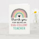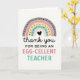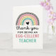 This card features a stylized rainbow on a soft off-white background, with gently wavy bands that feel a little imperfect in a charming way 🌷. The arcs move from light grey to blush pink, sunny yellow, and calming teal, with each colored band sprinkled with small, uneven black dots for added texture. Nestled on the innermost curve is a small solid black heart, like a quiet sign of affection between close friends. Beneath the rainbow, the words “thank you” appear in black, flowing lettering, with “FOR BEING AN” set just below in smaller, simple uppercase. The main line “EGG-CELLENT TEACHER” sits centered and stands out, with “EGG-CELLENT” in coral-pink and “TEACHER” in mint green, both in thick uppercase letters. The layout keeps plenty of open space, letting the rainbow and heart feel like a gentle hug on the page 🐰. Tiny black dots are scattered across the rainbow bands, and the black heart rests neatly near the inner arc.