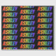 This exciting, vibrant, multicolored wrapping paper design features the common first name "ASHLEY" having a colourful rainbow spectrum inspired colouring pattern. The background is coloured black. Exciting wrapping paper like this might be fun to use when giving a present to somebody named Ashley. [~Z0000354]