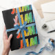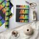 This fun, vibrant, exciting wrapping paper design features the common first name "JAMIE" having a colourful rainbow spectrum inspired colouring pattern. The background is coloured black. Colourful wrapping paper like this might be a fun way to wrap a present or gift being given to somebody named Jamie. [~Z0000354]
