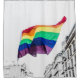 This is a great picture of the rainbow pride flag flying with a black and white picture of buildings in the background. Beautiful and strong symbol of pride.