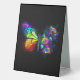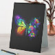 Rainbow, luminous, artistically painted monarch butterfly with bouquet of iridescent, bright, luminescent roses on black background. Rainbow butterfly.