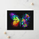 Rainbow, luminous, artistically painted monarch butterfly with bouquet of iridescent, bright, luminescent roses on black background. Rainbow butterfly.