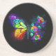 Rainbow, luminous, artistically painted monarch butterfly with bouquet of iridescent, bright, luminescent roses on black background. Rainbow butterfly.
