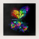 Rainbow, luminous, artistically painted monarch butterfly with bouquet of iridescent, bright, luminescent roses on black background. Rainbow butterfly.