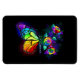 Rainbow, luminous, artistically painted monarch butterfly with bouquet of iridescent, bright, luminescent roses on black background. Rainbow butterfly.