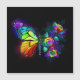 Rainbow, luminous, artistically painted monarch butterfly with bouquet of iridescent, bright, luminescent roses on black background. Rainbow butterfly.