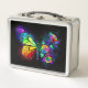Rainbow, luminous, artistically painted monarch butterfly with bouquet of iridescent, bright, luminescent roses on black background. Rainbow butterfly.