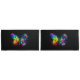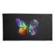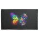 Rainbow, luminous, artistically painted monarch butterfly with bouquet of iridescent, bright, luminescent roses on black background. Rainbow butterfly.