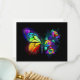 Rainbow, luminous, artistically painted monarch butterfly with bouquet of iridescent, bright, luminescent roses on black background. Rainbow butterfly.