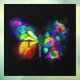 Rainbow, luminous, artistically painted monarch butterfly with bouquet of iridescent, bright, luminescent roses on black background. Rainbow butterfly.